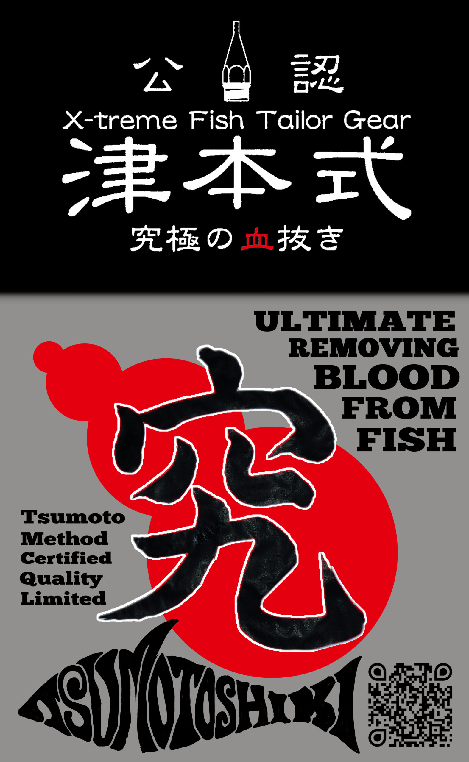 日本らしくまた津本式らしさを象徴する文字として究極の血抜きの頭の字である『究』を選定。『究』の字は有段者自ら毛筆。取り込んでデザインに反映。字体は、日本らしさとCOOLな墨のテカりを残している。選んだ文字は「究」。言わずもがなのultimate。海外取引先とやり取りするときにも血抜きの内容をダイレクトに説明、PRしやすく伝わりやすい漢字と考えた。国内関係者にもあまり時間がかからずに一目瞭然のラベルになる。遠くからでも津本式魚だと判別できるように分かりやすいシンプル配色。MADE IN JAPANを想起させるようなやんわり国旗を連想する四角と丸の形状配置と色調バランス。あくまで国旗は連想させる、であり、実際は赤血球が連なっている血管内を走っている様子をイメージしたデザインとなっている。血をコントロールしてエイジングフィッシュ、美味しい魚は成り立つのだというPRに繋がる。またこの赤色の明るい彩度明度は釣りたてのエネルギーに溢れた状態の魚の血としての色相に調整した。奇をてらうような複雑な模様は避け、字体も英字フォント明確で力強いローマン系を使用。『tsumotoshiki』で魚を形成したデザインでラベルの意味を視覚的に伝える この魚から血(赤血球)が抜けていってるイメージの配置。白ではなく、グレー基調にすることで出荷箱や魚に貼っても汚れが目立たないように配慮している。QRコードを読み取ると、処理した人のプロフィール、各種SNS、海外の人にも津本式を理解してもらえるような説明やおすすめの受け取り後の処理が伝わるURLへアクセスできるようになっている。