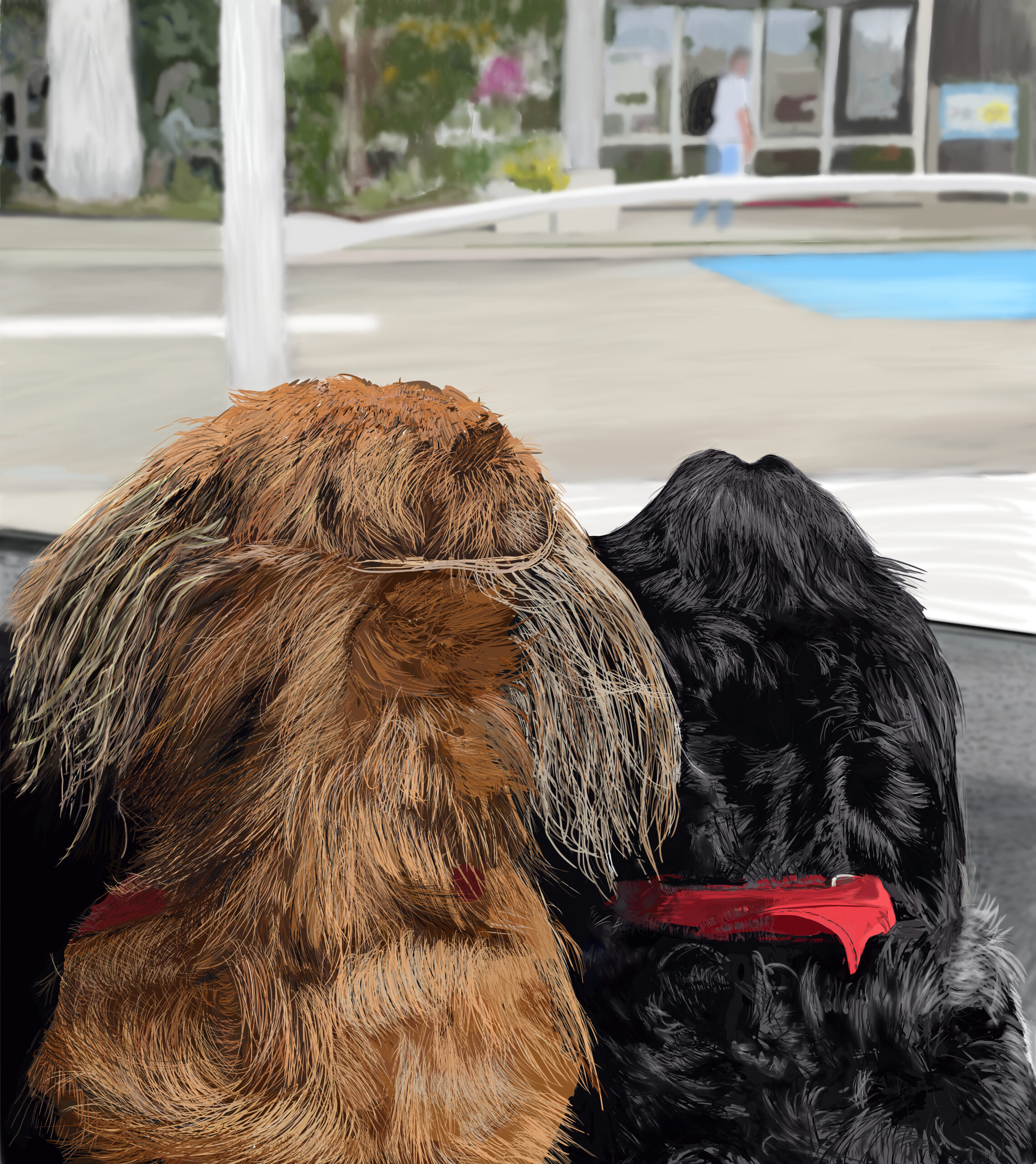 二人の名前はトロ君とハク君。毛色、毛並みの特徴もそれぞれ違うので全く違うアプローチで色を線を重ねていきました。画数はおそらく本当の毛量というか毛の本数よりも多いでしょう。そのままの二人を表現するために必要な作業でした。絵をお渡ししたとき、プリントアウトされた写真と勘違いされました。「部屋の目立つ場所に飾る。」「家宝や」と喜んでいただき、感無量の作品になりました。